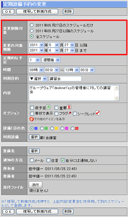 ※上記の例で定期設備予約の削除を行った場合、定期的な予約として登録されていた全ての予約が削除されます。