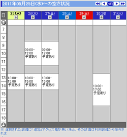 空き状況設備選択画面で検索対象に指定された設備の週間スケジュールの空き状況が表示されます。