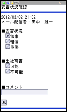 安否状況確認の入力をした後、「OK」ボタンを押してください。