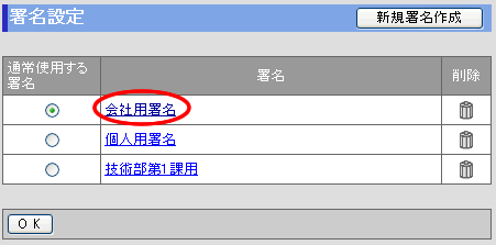 署名一覧から通常使用する署名のラジオボタンを選択します。