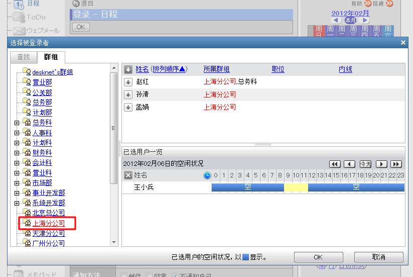 点击「查找」后,输入姓名栏即可显示。 在「姓名」「平假名」「职位」「邮件地址」「电话号码」项目中分别输入关键词语后,点击「查找」,即可查找用户。 查找出的用户一览将显示在页面右上方。