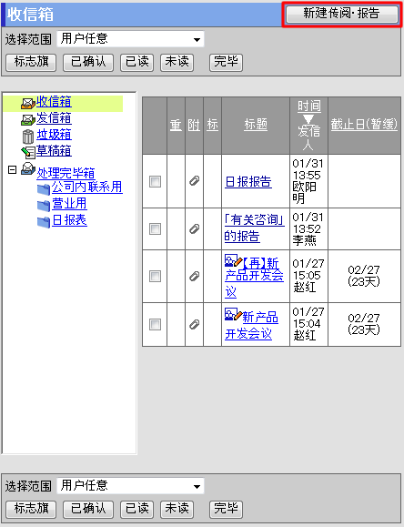※如果是尚未完毕的传阅・报告,在“截止日期”已过时,将被自动设定为完毕。 |