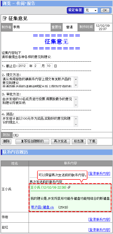 ※被再次发送的传阅・报告的联系内容栏内,留有再次发送前的联系内容显示。