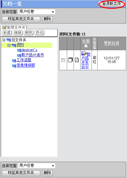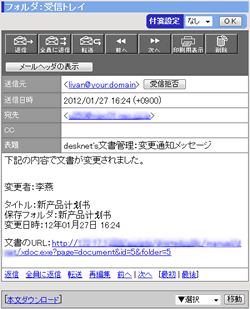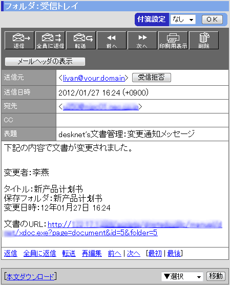 被设定为发送通知邮件的文件夹内,如有新文件登录或有文件被更改时,将给设定为被通知者的群组或用户发送通知邮件。