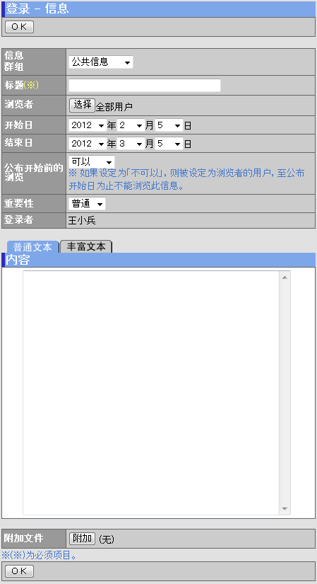 可以使用丰富文本功能编辑信息的内容。 ※有关操作方法,请参照此处。 ※丰富文本功能,从Microsoft Internet Explorer5.5以上版本的浏览器开始可以使用。