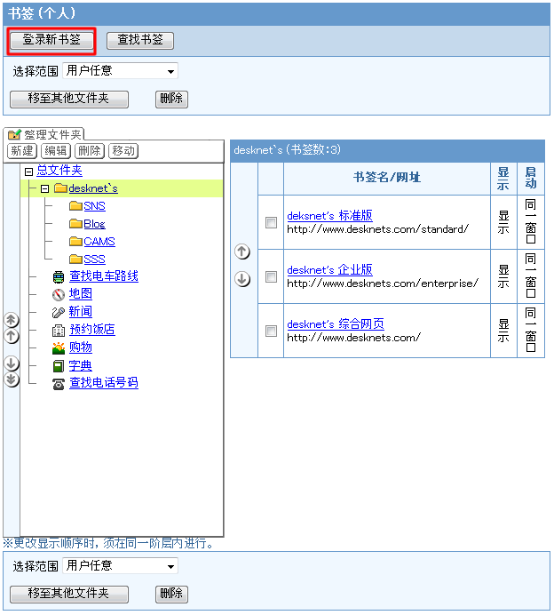 公共书签,除了总页以外,还可以显示在登录页面和选项菜单中。