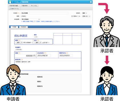 申請者に仮払申請書や仮払精算申請書を印刷して持参させたり、担当者がファイルされた申請書を探したりする手間なく、効率的に仮払金の支払い・精算処理を行えるようになります。