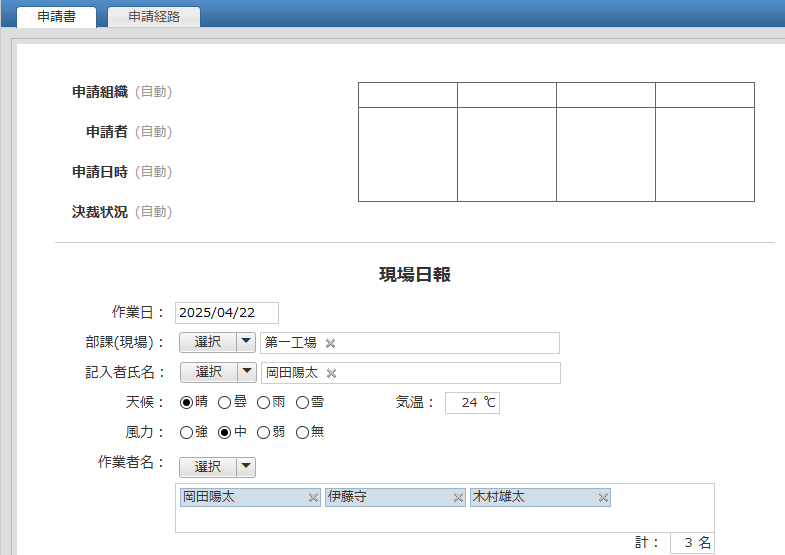 現場の作業内容や作業の進捗状況を報告するための申請書アプリです。