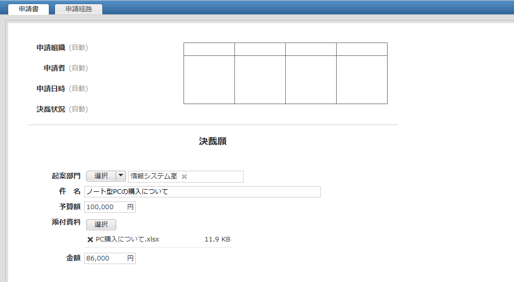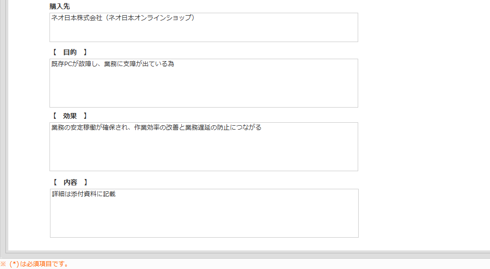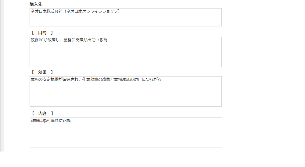 所属、氏名、起案部門、件名、予算額、添付資料、金額、購入先、目的、効果、内容