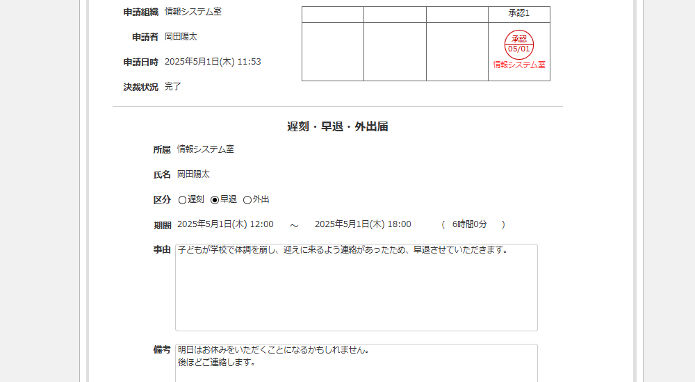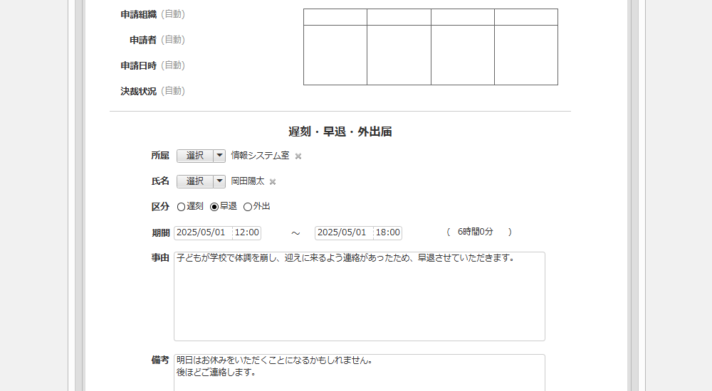 遅刻・早退・外出を会社に届け出るための申請書アプリです。