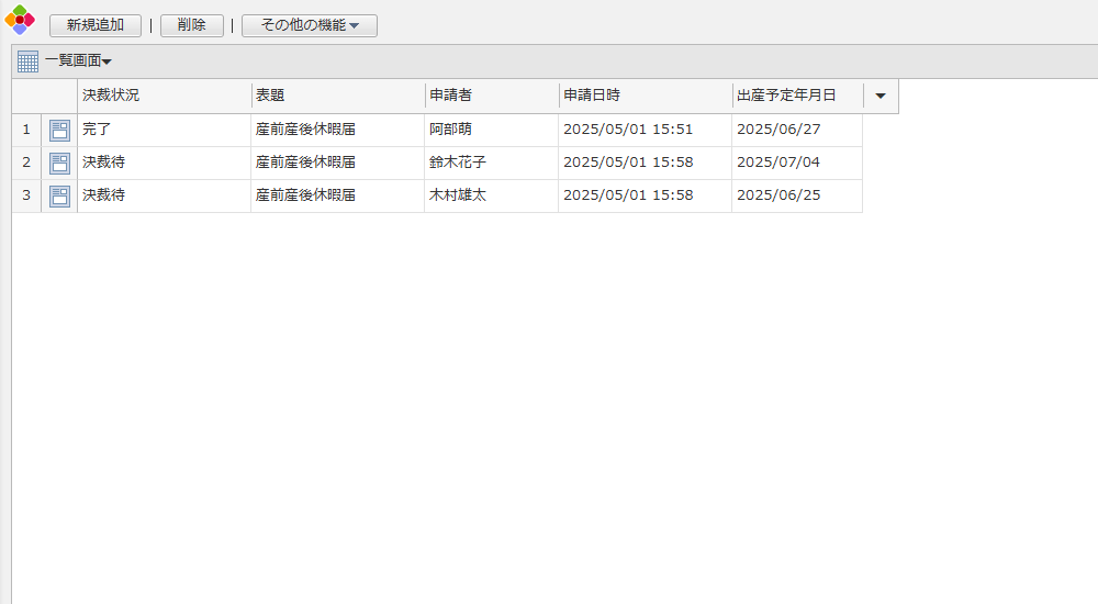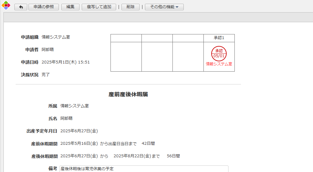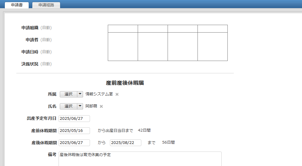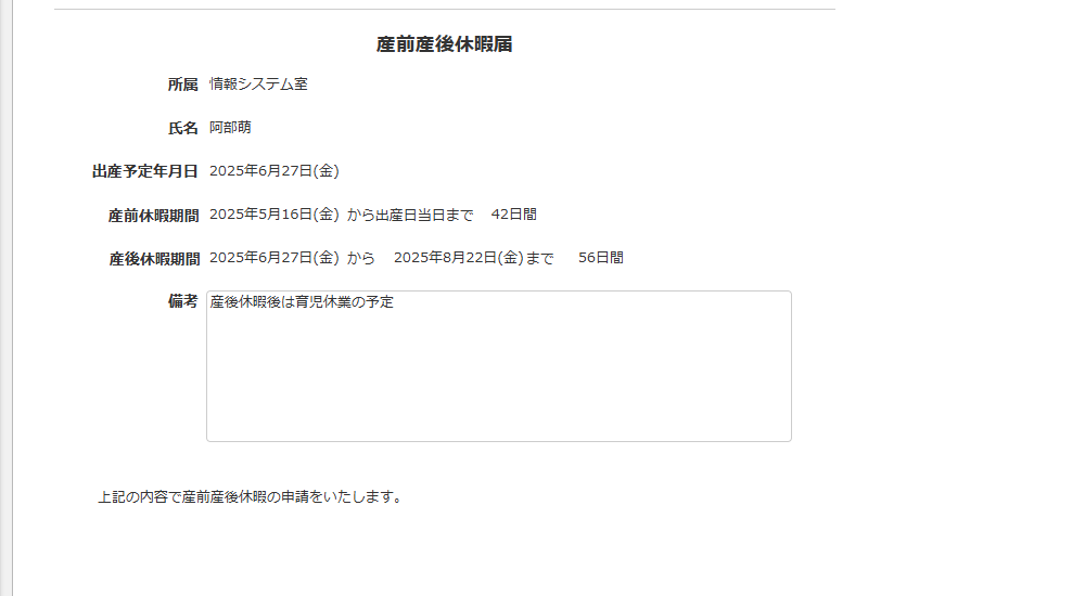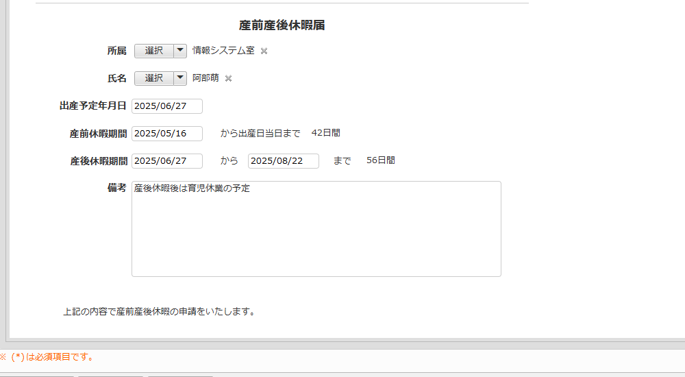 産前産後休暇の届出を行うための申請書アプリです。