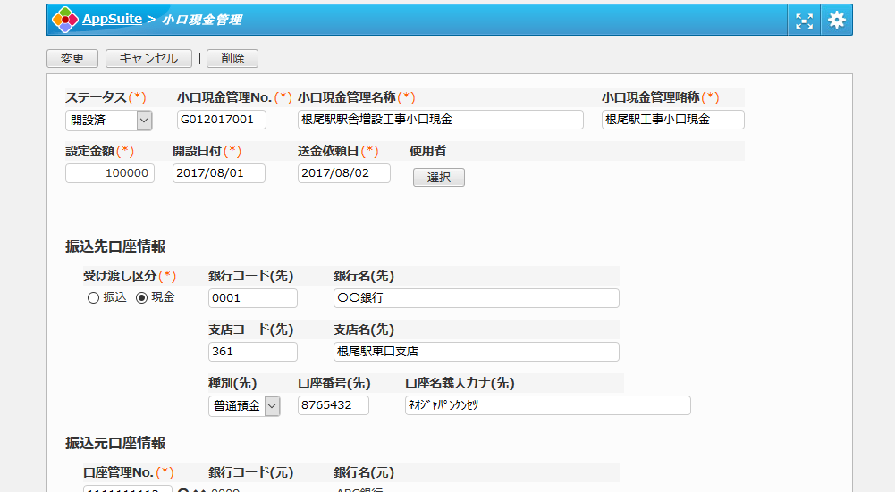 小口現金管理No.、小口現金名称、使用者、設定金額、振込先および元の口座情報