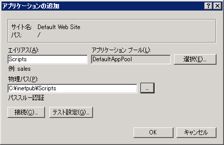 "Default Web Site"をマウスの右ボタンでクリックし、プルダウンメニューから「アプリケーションの追加」メニューをクリックしてください。