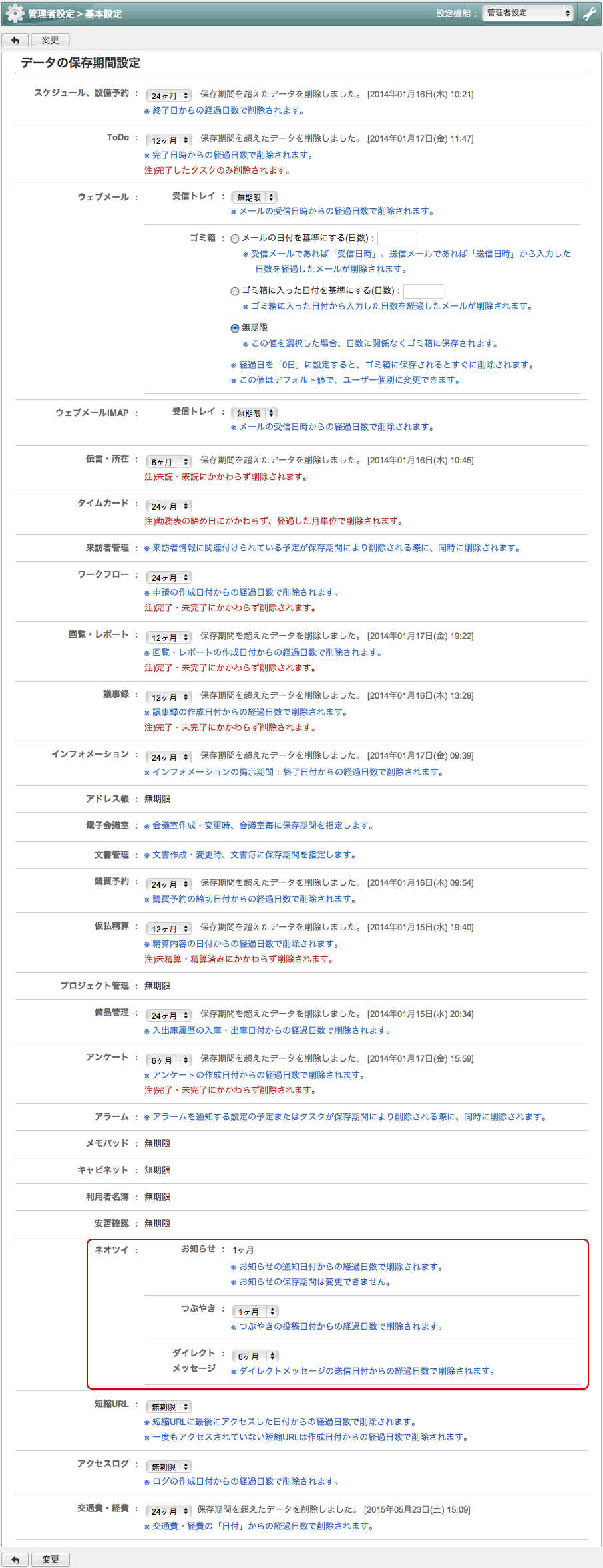 これまで ウェブメール>システム管理>共通設定 にあった「メール送信前の確認」項目、「送信の取消し」項目が、誤送信防止設定画面に統合されました。
