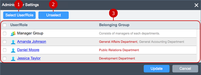 (For more details about user/role selection, please refer to Common Functions for All Screens > User/Group/Role Selection in User's Manual.)