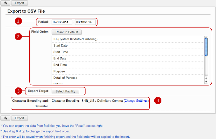 * Application administrators of Facility Reservation (Managed Group: Belonging Group) can export the facilities that they have the permission to access or managed by their belonging groups.