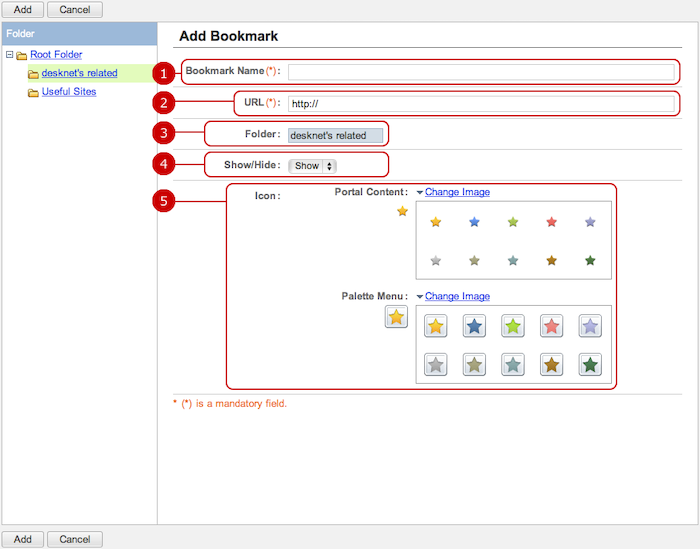 Choose icons for the bookmark. You can set icon to be displayed in the portal content and icon to be displayed in the palette menu. Icon can be selected from predefined icons. When you press "Change Image" link and choose "Upload Image" from the menu, the uploading screen is displayed. You can press "Browse" button to choose an image file to upload.