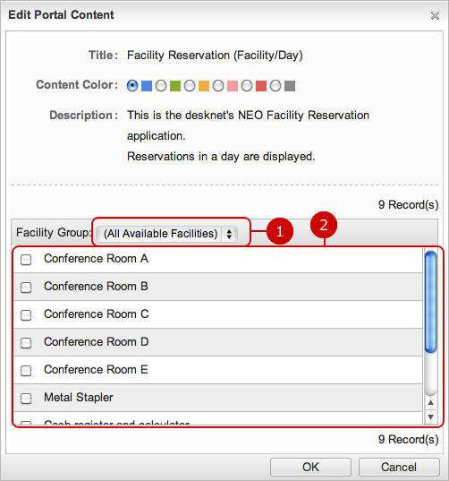 The list of facilities. Check the check boxes of facilities to be displayed in the Facility Reservation content in Portal screen.