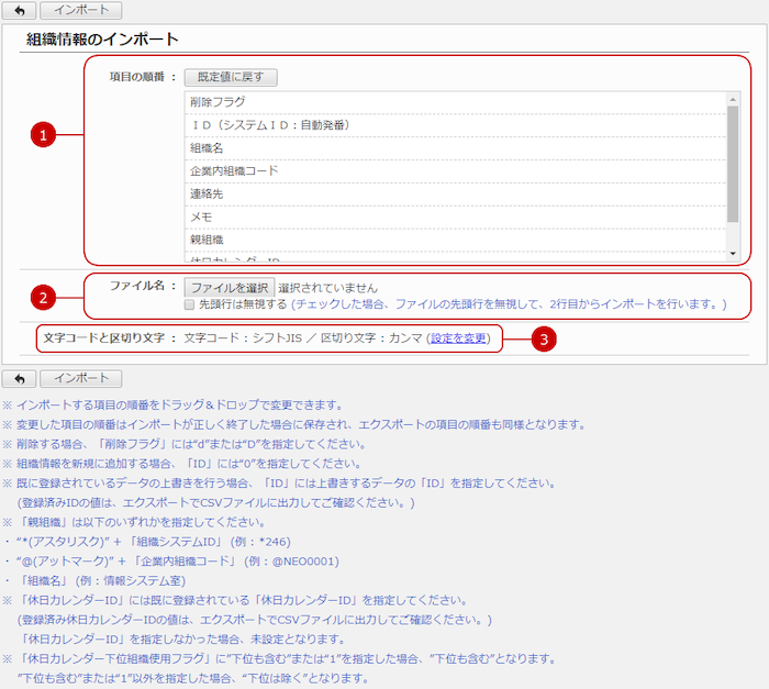 ※機能管理者の管理対象が「所属組織のみ」、「選択した組織」の場合、組織情報のインポートは利用できません。