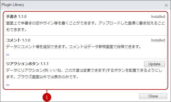 - A plugin list is displayed. Click […] to show the plugin information in detail. Click [Install] or [Update] to open confirmation dialog. Confirm content and click [Yes] to install the plugin.