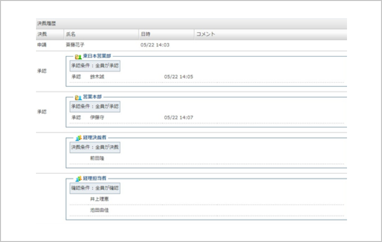 自分の申請がどこまで進んだのかがひと目でわかります。ワークフロー機能を使うことで紙を使用した申請と異なり、途中で紛失される心配がなくなります。