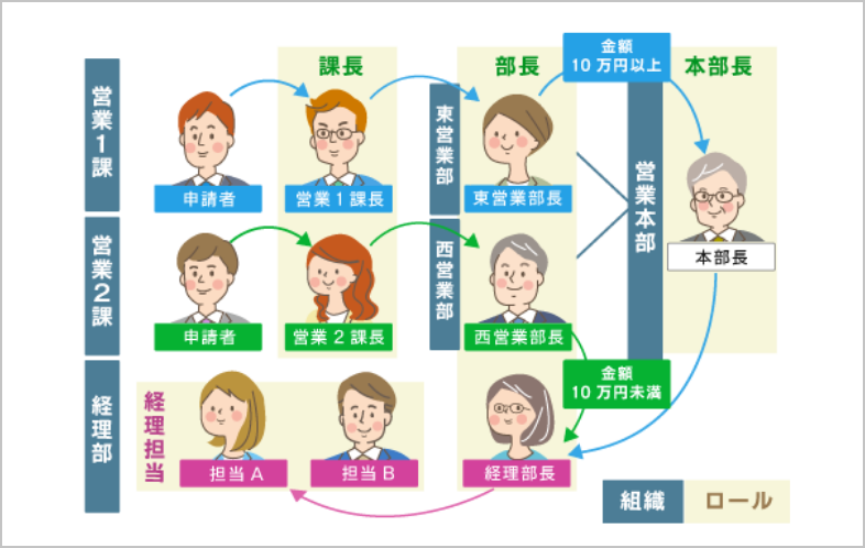 決裁金額などの条件に応じた申請経路の分岐や、決裁者・承認者・確認者の決裁種別の指定が可能です。また、経理担当者といった役割を指定して経路を設定できるため、人事異動時の負担を軽減します。
