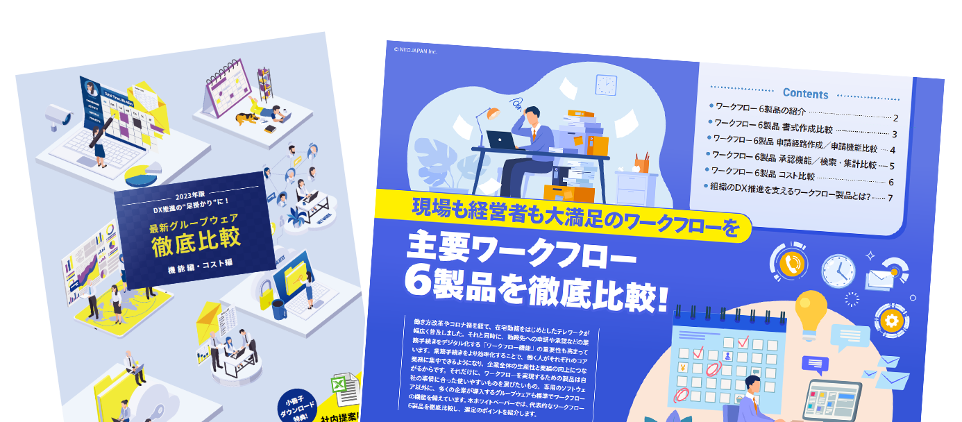 勤務先への申請や承認などの業務手続きをデジタル化する「ワークフロー」。業務手続きをより効率化することで、働く人がそれぞれのコア業務に集中できるようになり、企業全体の生産性と業績の向上につながるため、ワークフローを実現するための製品は自社に合った使いやすい製品を選びたいものです。ワークフロー製品を導入するにあたって、グループウェアもその選択肢のひとつになるでしょう。
