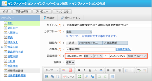 インフォメーションの公開開始日を変更すると、自動的に公開終了日の日付が調整されるようになりました。公開期間を設定する際の手間が軽減されます。