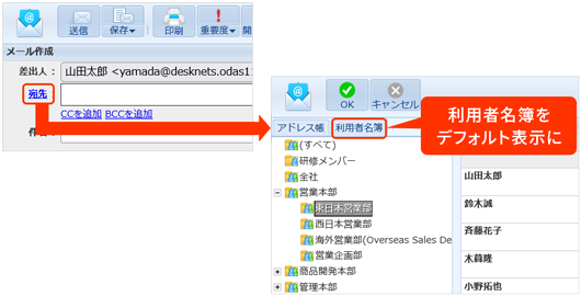 ウェブメール画面からアドレス帳を開く際、またメール作成画面から宛先を指定する際に、アドレス帳と利用者名簿のどちらを初期表示するかを設定できるようになりました。