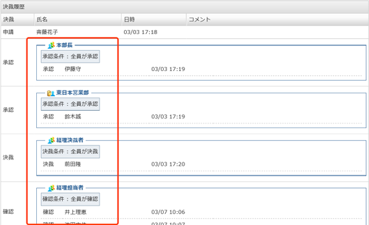 申請・承認時の決裁履歴欄に表示される「承認条件:」について、これまで固定表示だったものを、経路に設定された経路種別に応じて切り替えるようにしました。