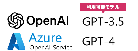 OpenAI 社による ChatGPT のほか、マイクロソフト社が提供するAzure OpenAI サービスもサポート。モデルは、GPT-3.5 (4K/16K) または GPT-4 (8K/32K) から選択いただけます。