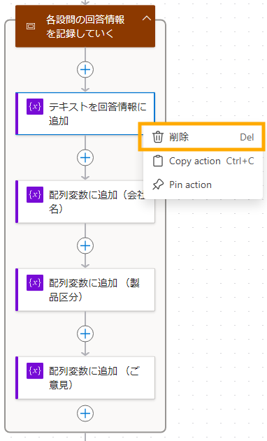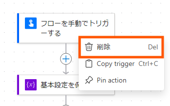 ①フローの一番上の「フローを手動でトリガーする」を右クリックして「削除」をクリックし、削除します。