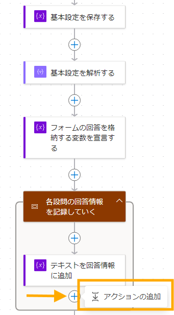 ⑤「新しい応答が送信されるとき」の下にある「+」をクリックし、「アクションの追加」を選択します。