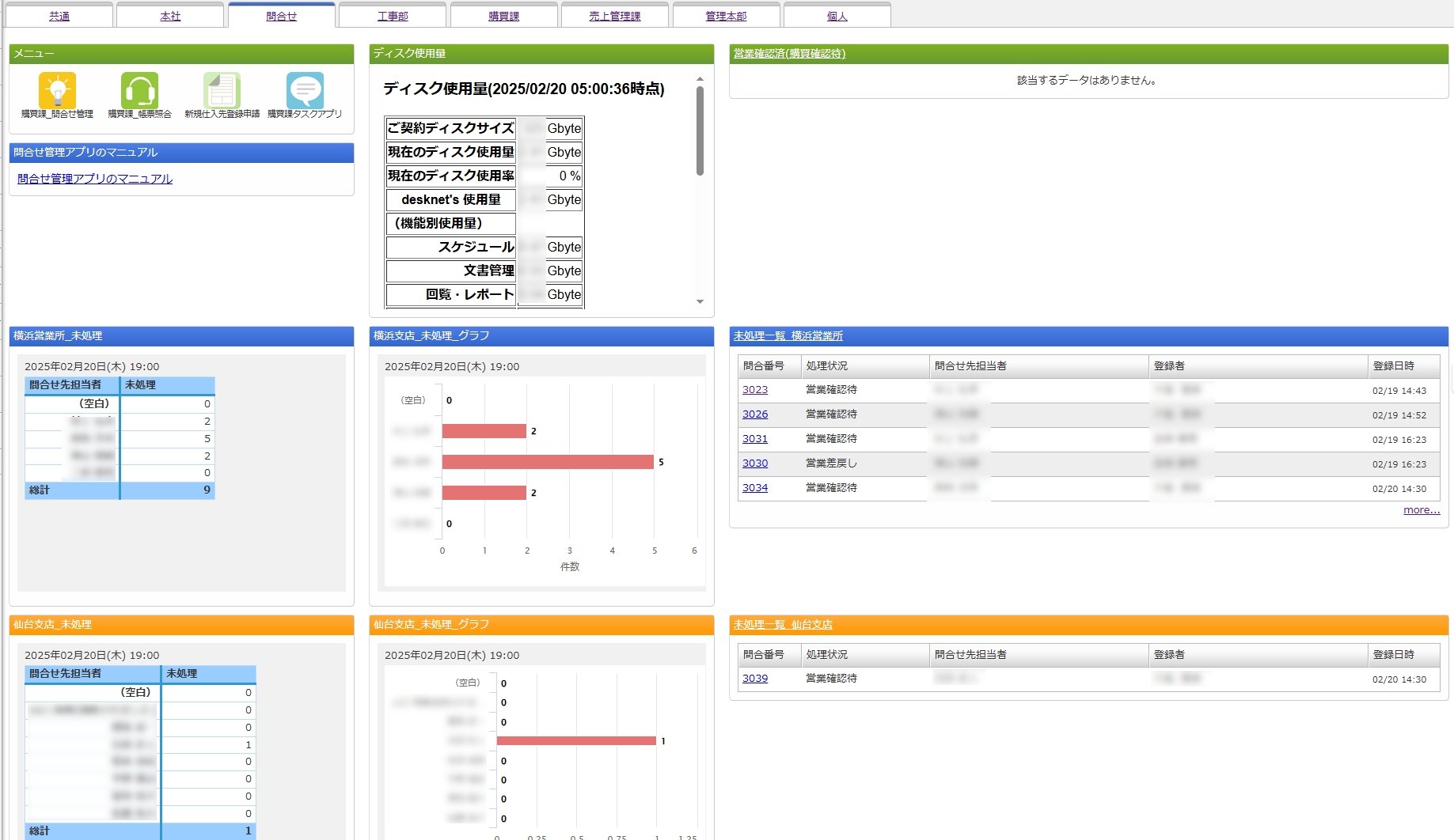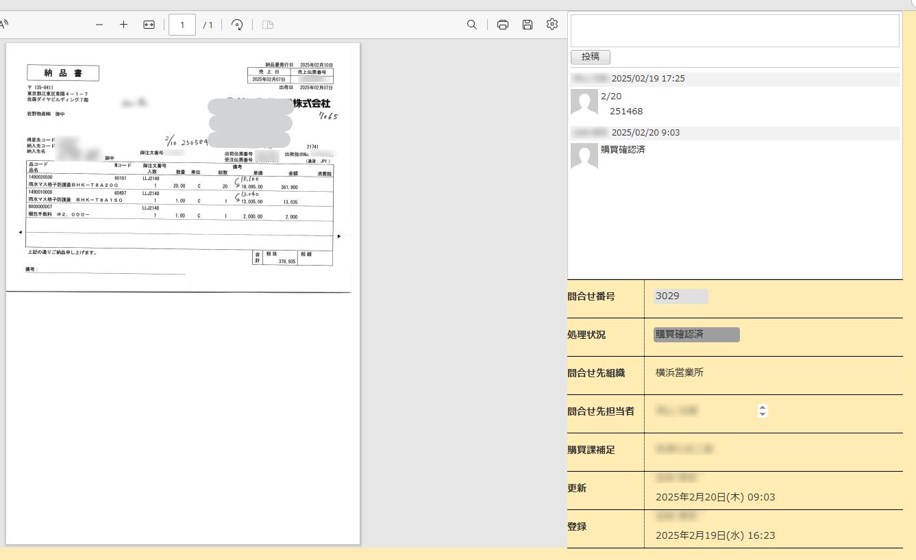 本社管理部購買課と各支店営業間で請求書に関する情報を共有する「問合せ」という業務があります。購買課から各営業所にFAXし、各営業者がFAXで回答を返信するため、本業務だけで月に600枚近くの請求書をFAXでやり取りしていました。FAXを担当営業が見ているのか、紛失してしまったのかが購買課側からは分からず、営業所でFAXを紛失し、未回答のまま放置されることも多々ありました。