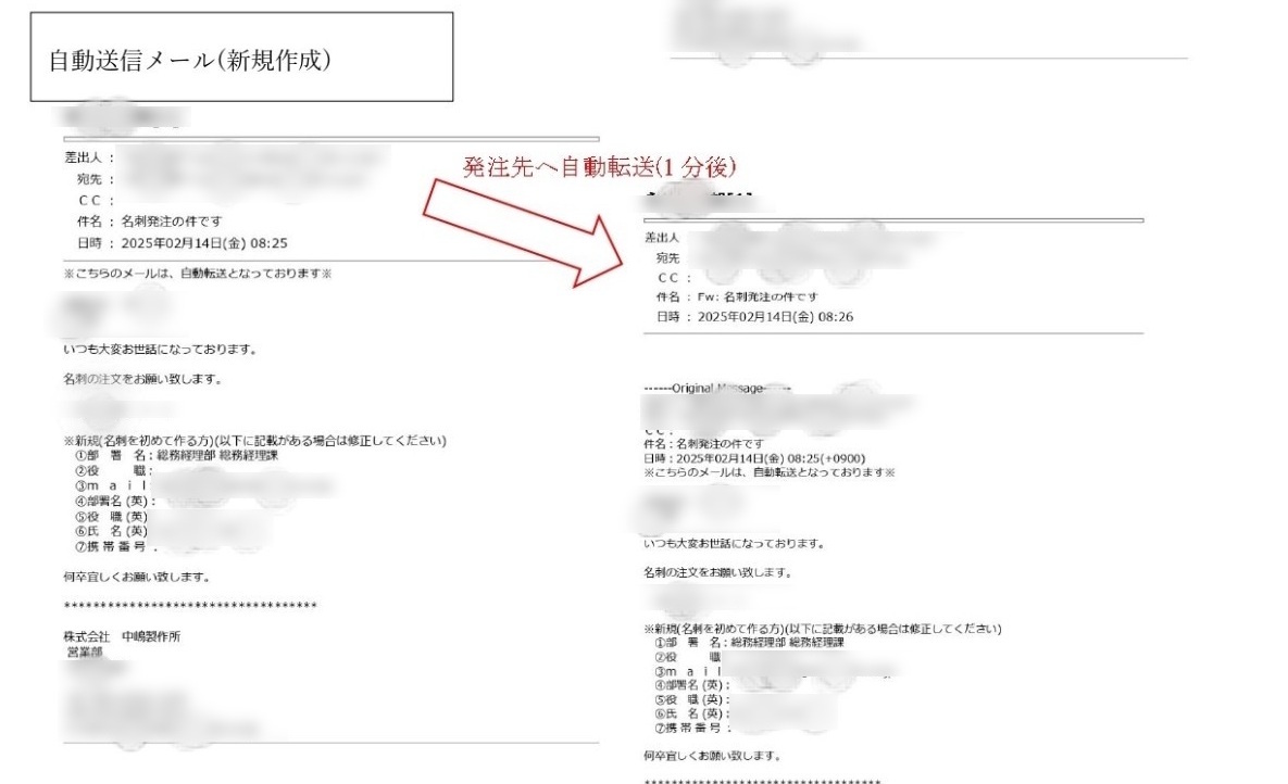 アプリにて名刺発注をすると、名刺発注管理者と発注先へ入力情報を基にした発注メールが自動作成・自動送信されるように設定をしています。そうすることで、名刺発注者は好きな時に発注ができるようになり、修正点があった場合はその時に直接修正ができるため忘れ等がありません。