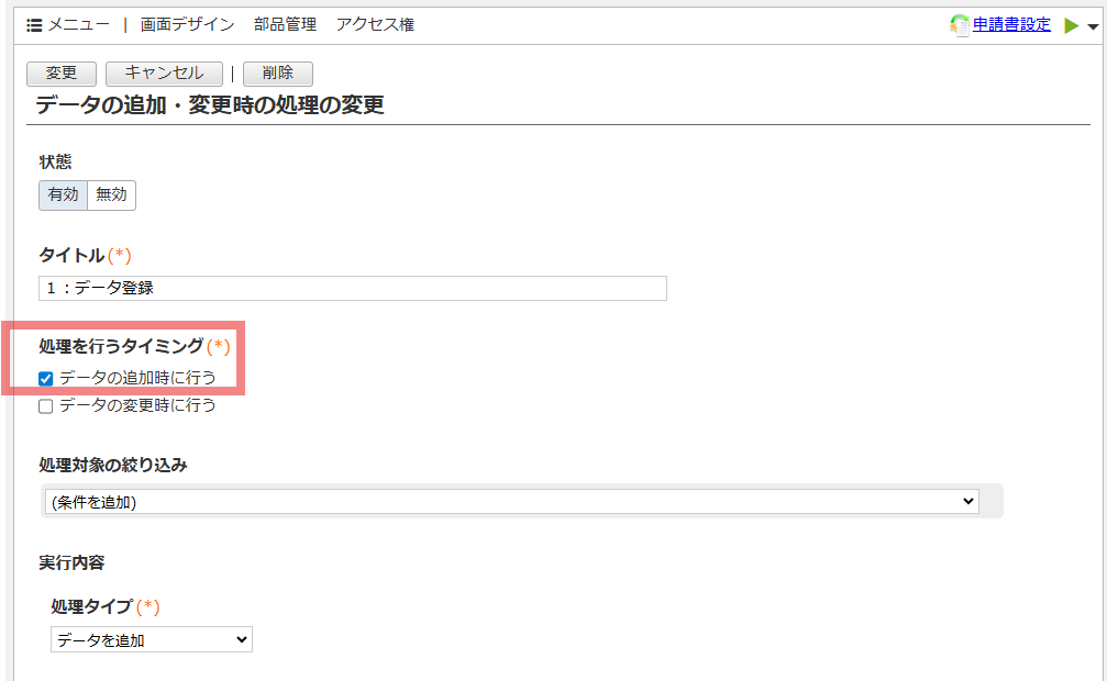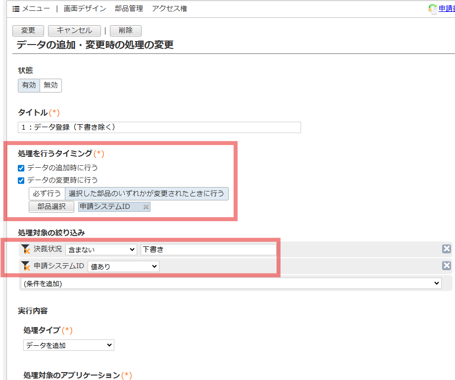 ・「申請システムID」や「申請日時」が“値あり”になるタイミングで実行する