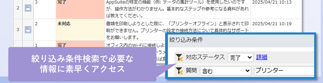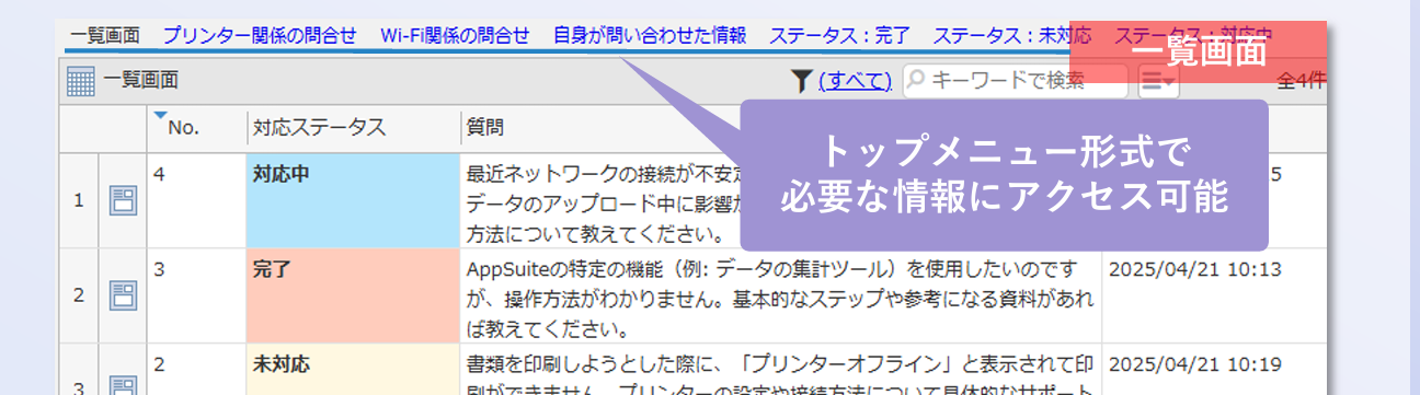 「ITサポート窓口」アプリでは、問い合わせ内容を「未対応」「対応中」「完了」などのステータスで色分けして表示できます。さらに、絞り込み条件検索を活用することで、「未対応」の問合せのみを表示することもでき、対応漏れを防ぎます。