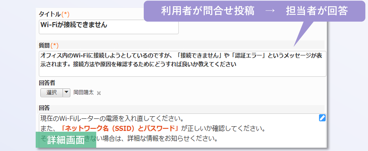 「ITサポート窓口」アプリでは、利用者が問い合わせ内容を投稿し、担当者がそれに対して回答できる仕組みになっています。