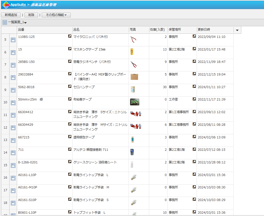 写真も登録しているため、一目でどんなものか分かる画面を作成し、AppSuiteで管理することで、在庫数の見える化を実現しました。