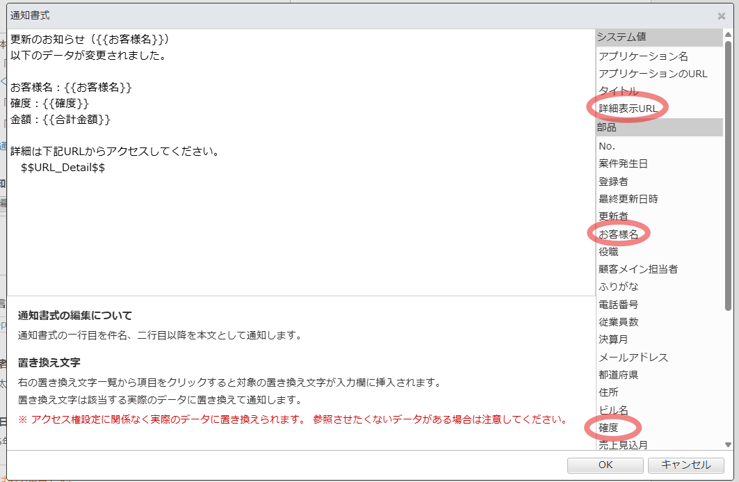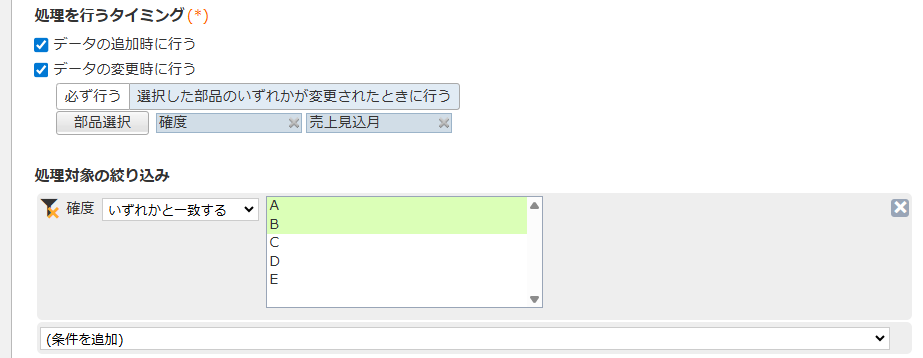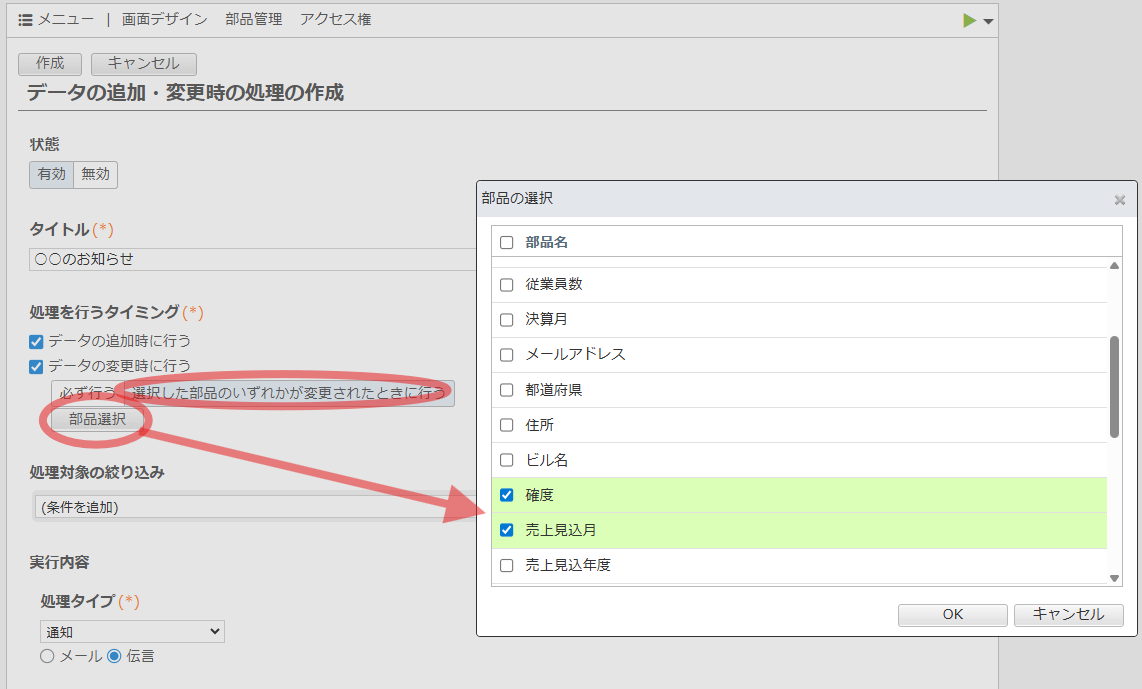 例では、[確度]や[売上見込月]が変更された場合のみ通知とします。