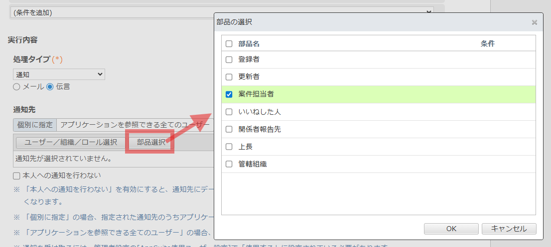 ここでは、案件担当者に通知する場合は、部品管理から選択します。