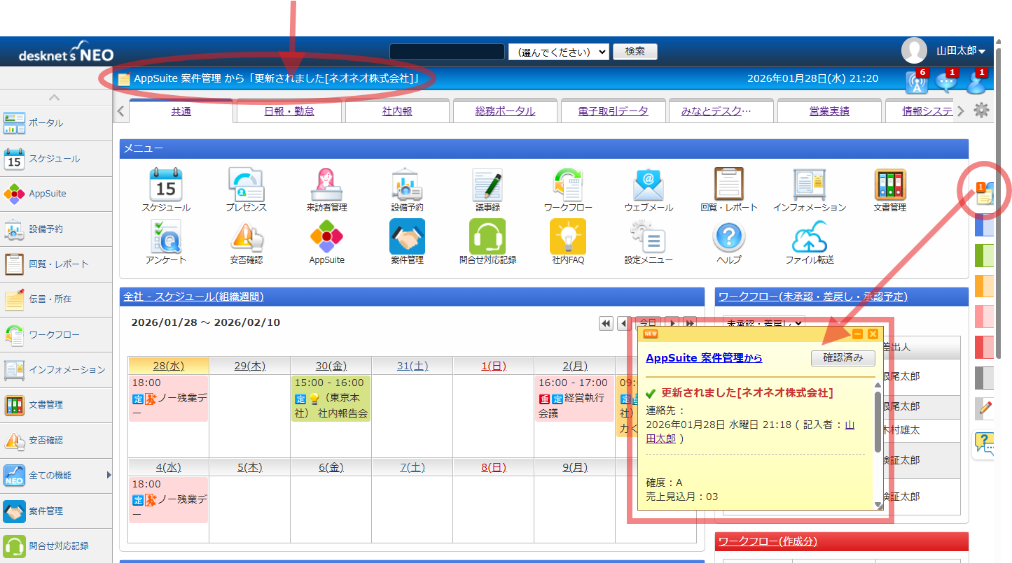 これまで新着通知はEmailで対応していましたが、V9.5からは伝言機能による通知が可能になりました。