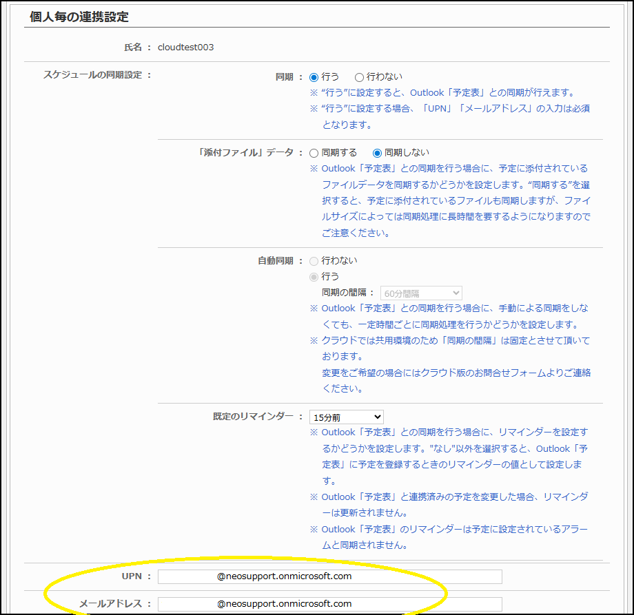 ユーザー情報連携設定内のUPN/メールアドレスとMicrosoft 365側のUPN/メールアドレスが一致していないとスケジュールが同期されません。また、スケジュール同期後にUPN/メールアドレスの変更を行い、Microsoft 365側のUPN/メールアドレスと一致しない場合、登録済みのスケジュールが削除されることもあります。
