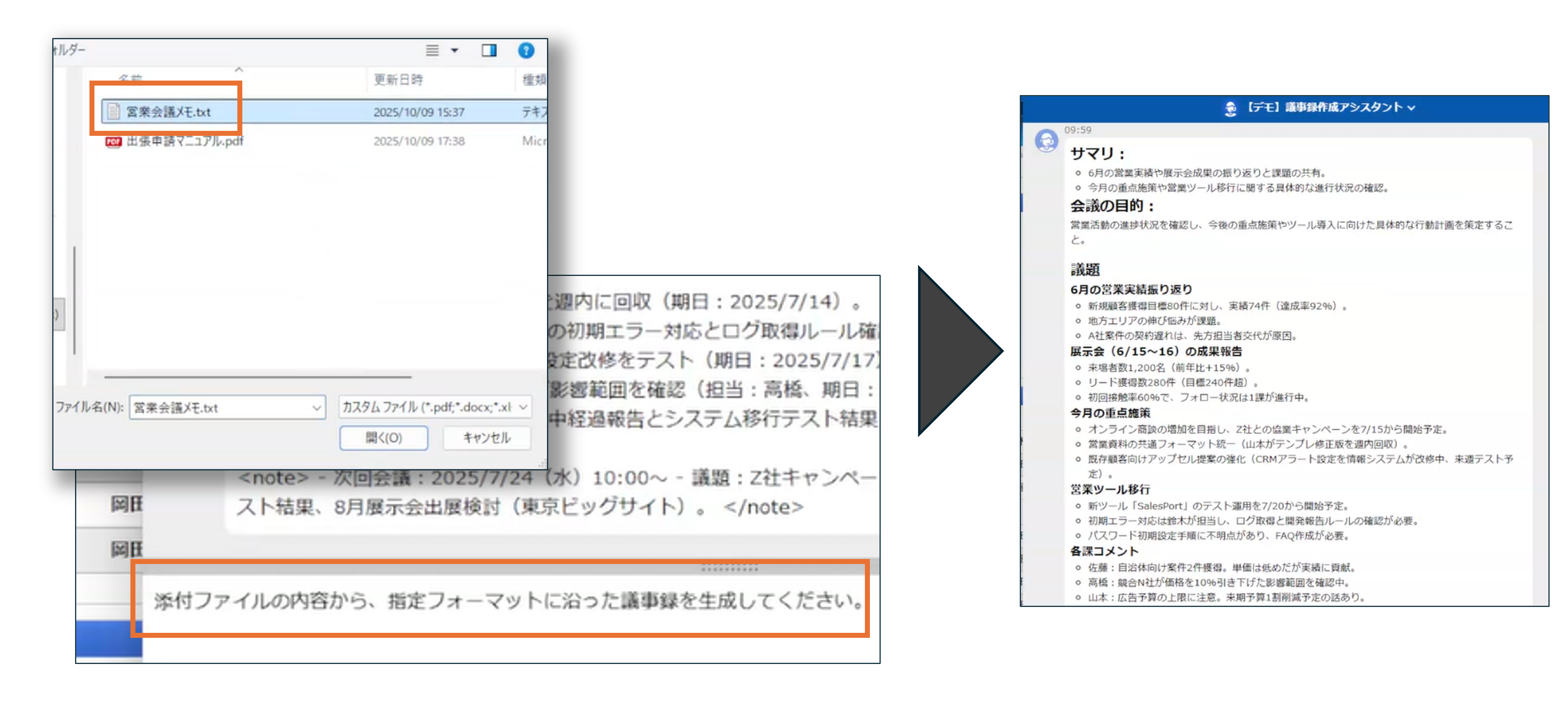 「添付ファイルの内容から、指定フォーマットに沿った議事録を生成してください。」というプロンプトとともに、営業会議のメモを添付して送信します。 するとAIが、会議の目的・発言者ごとの内容・決定事項 などを整理してまとめてくれます。また、文字の強調やレイアウト装飾も自動で施され、視覚的にも非常に見やすい議事録に仕上がります。