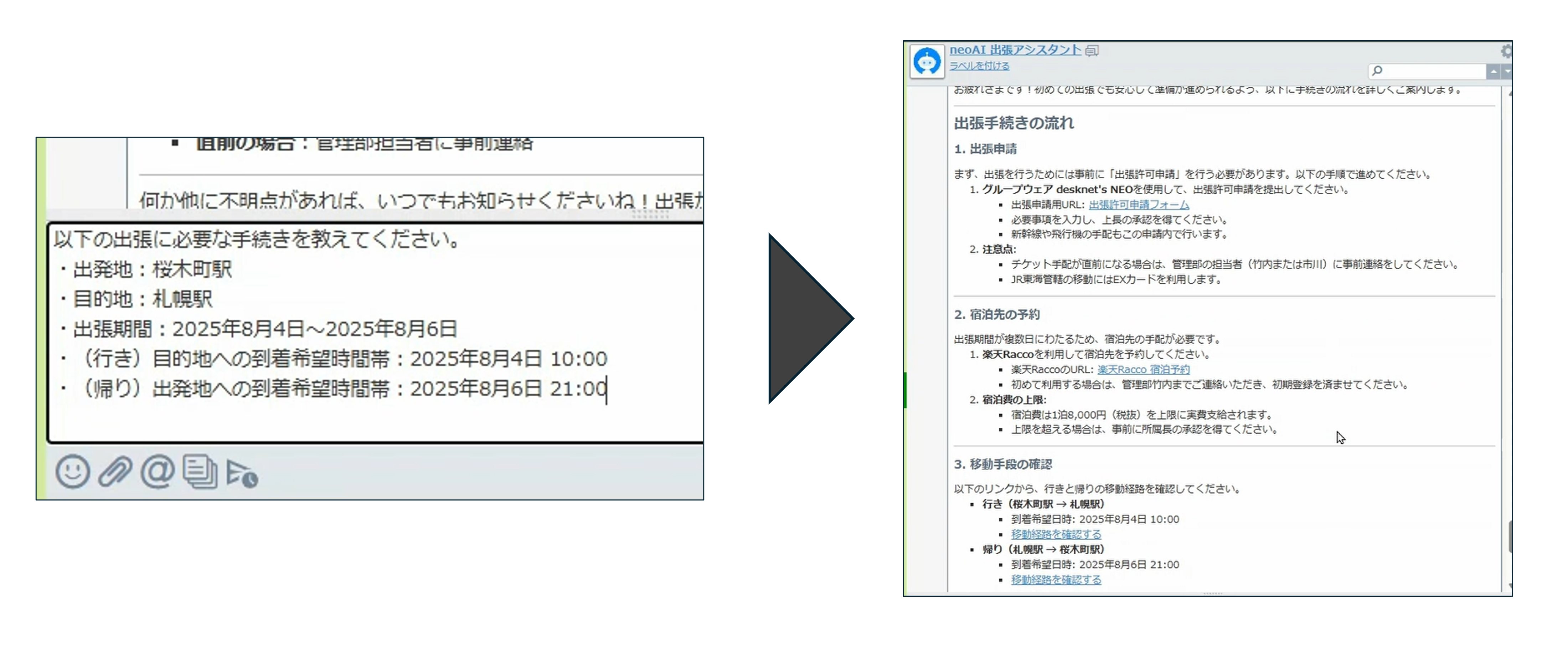 「(出発地と出張期間を伝え)この出張に必要な手続きを教えてください」というプロンプトを送信します。するとAIが、事前に学習した会社の出張マニュアルをもとに、出張申請・経費清算・宿泊/交通手配といった必要なステップをわかりやすく提示してくれます。