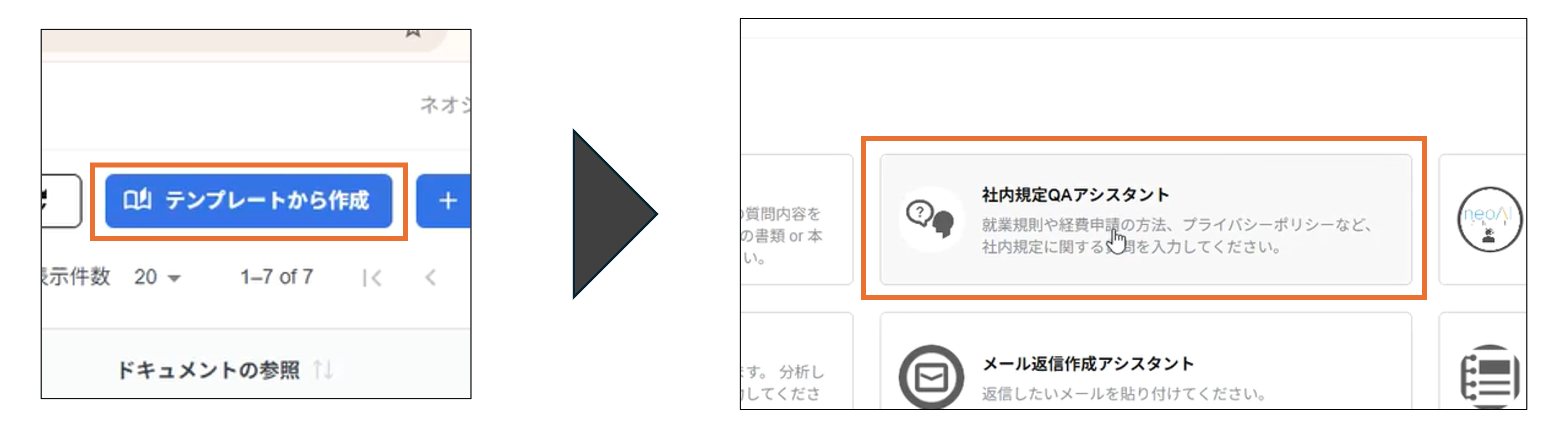 設定画面右上の「テンプレートから作成」をクリックし、アシスタントを選択します。今回は「社内規定QAアシスタント」を選択します。
