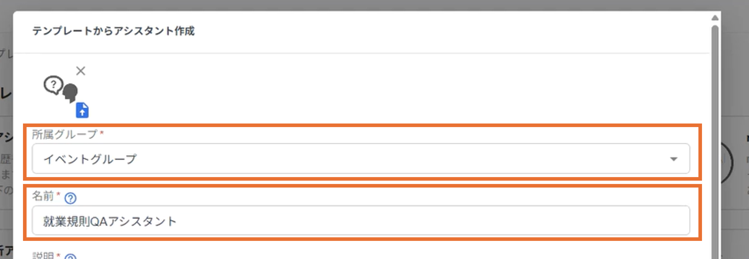 所属グループを選択し、アシスタントの名前を変更します。(例:「就業規則QAアシスタント」など)