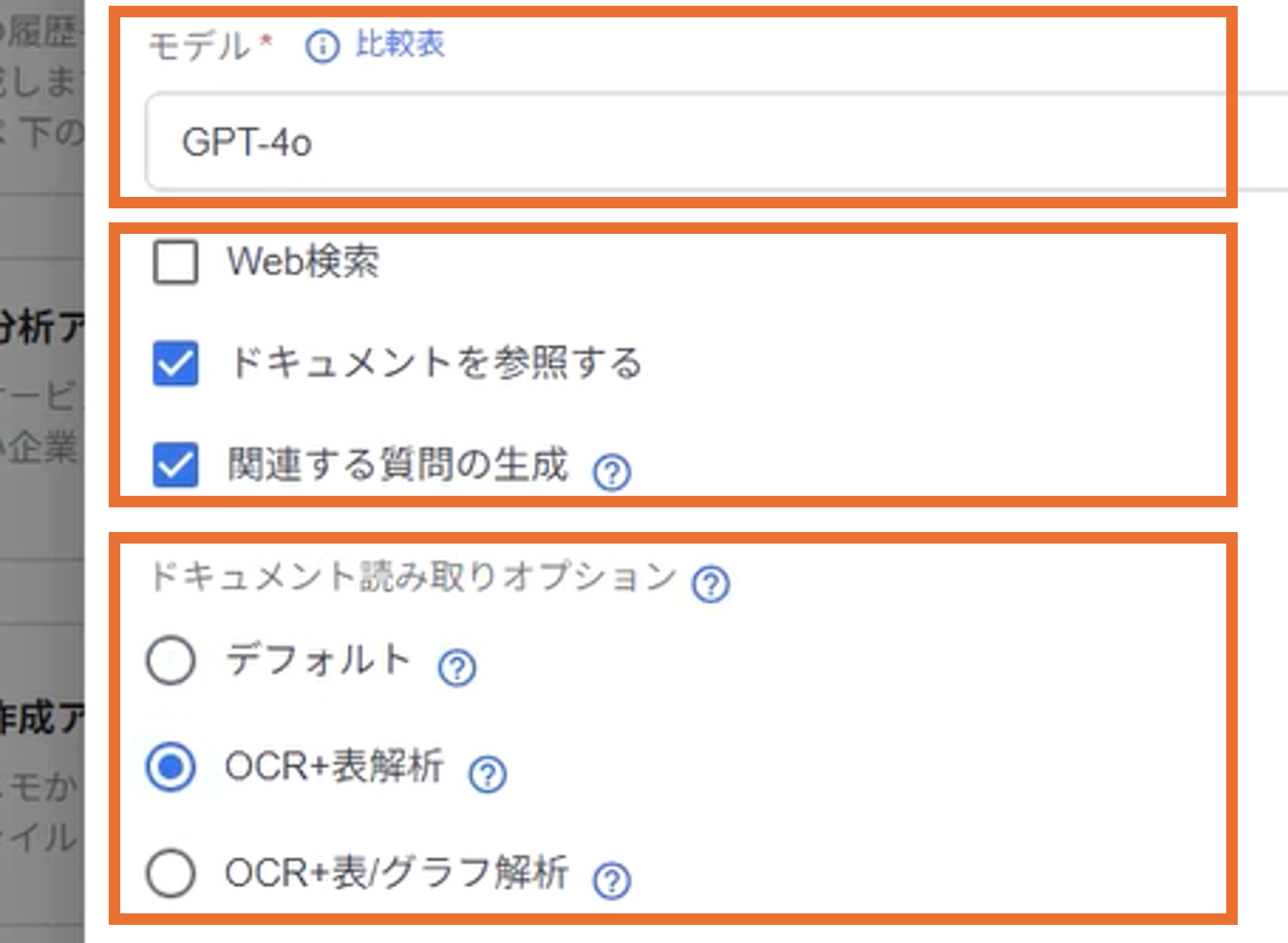 AIモデルと検索手段(Web検索、ドキュメントを参照する、など)、オプション(OCR+表解析、など)を選択します。
