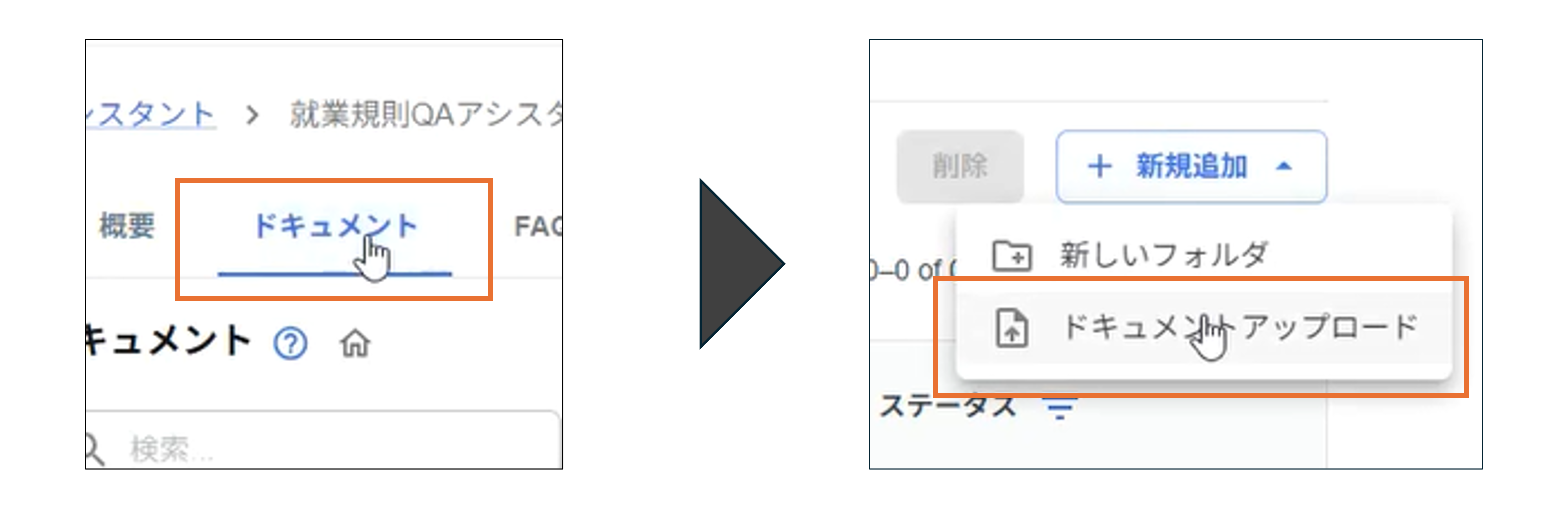 次に、「ドキュメント」タブから学習させたいデータをアップロードします。