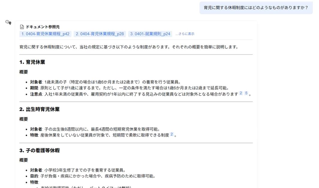 するとAIは、先ほどアップロードした就業規則や育児休業規程を参照しながら、